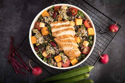 - Bij de lunch: vermijd de standaard boterhamdoos. Kies liever voor een maaltijdsalade met quinoa, peulvruchten en een eiwitbron (kip/vis/tofu).